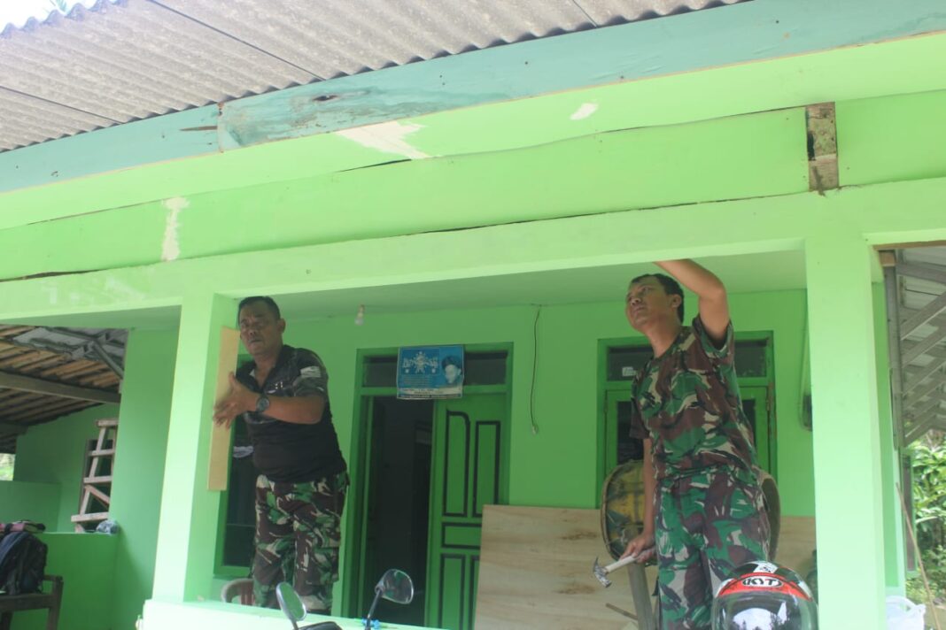 Di pelataran Desa Somagede, suara gesekan tangga dengan dinding masjid berpadu dengan takbir yang samar terdengar dari kejauhan. Di atas ketinggian, Sertu Sukarim, anggota Satgas TMMD, berdiri tegap. Di tangannya, lembar demi lembar ternit diangkat, disusun, dan dipasang dengan ketelitian seorang prajurit yang tak hanya bekerja, tetapi berkhidmat.