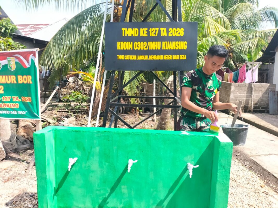 Kuantan Singingi – Program TNI Manunggal Membangun Desa (TMMD) ke-127 Kodim 0302/Inhu terus berupaya meningkatkan kualitas hidup masyarakat, salah satunya melalui penyediaan akses air bersih. Pada hari Minggu, 1 Maret 2026, Satgas TMMD melanjutkan kegiatan pengecatan dinding kran air untuk sumur bor yang berlokasi di Dusun 2 Desa Koto Rajo, Kecamatan Kuantan Hilir Seberang, Kabupaten Kuantan Singingi.