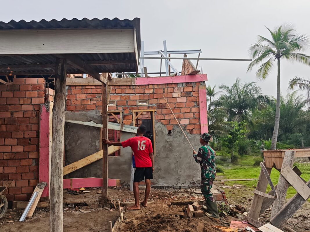 Banyuasin – Anggota Satuan Tugas (Satgas) TNI Manunggal Membangun Desa (TMMD) ke-127 terus memacu pengerjaan Rumah Tidak Layak Huni (RTLH) milik Bapak Paiman. Pemasangan rangka baja dan plester dinding menjadi fokus utama saat ini. Minggu (1/3).