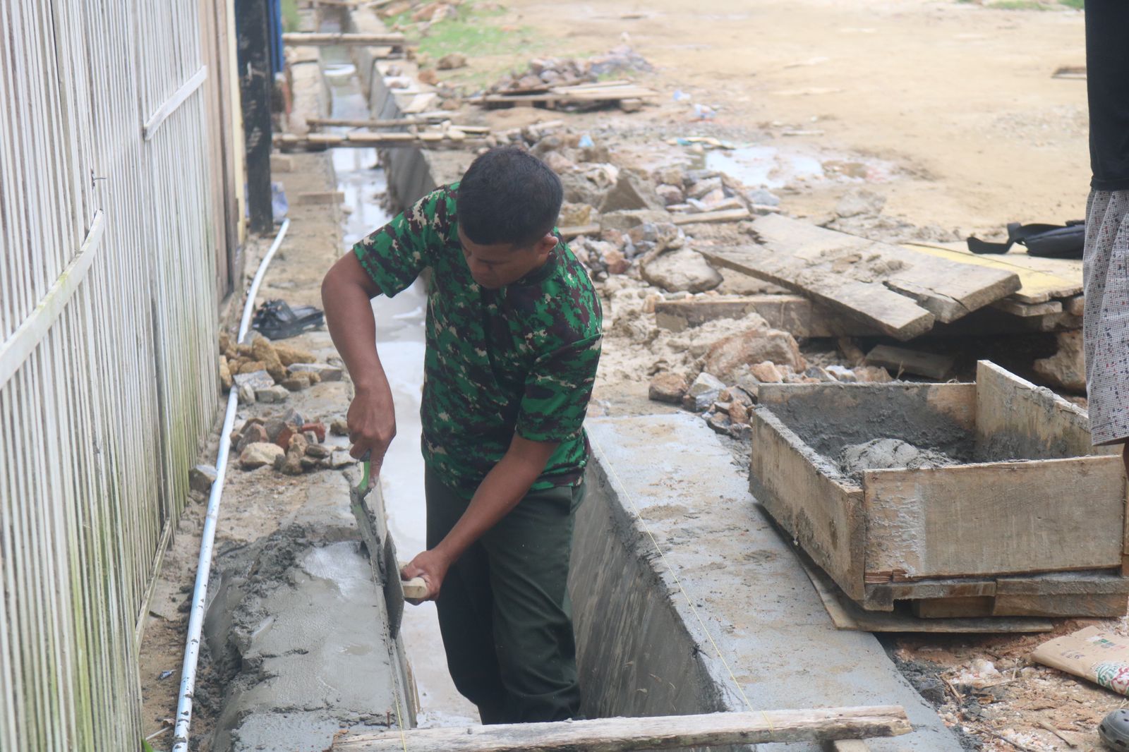 Dengan balutan seragam loreng yang penuh noda semen, para prajurit bekerja bahu-membahu memastikan setiap jengkal saluran air terbangun dengan kuat guna mengantisipasi banjir di musim penghujan.