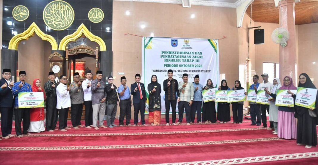Sawahlunto, dutametro.com – Badan Amil Zakat Nasional (BAZNas) Kota Sawahlunto distribusikan zakat reguler periode Oktober 2025. Pendistribusian itu dihadiri Wali Kota Sawahlunto Riyanda Putra di Masjid Agung Nurul Islam, Senin (1/10/2025). Pada periode ini, zakat yang disalurkan senilai total Rp659,9 juta dengan jumlah mustahik penerima sebanyak 1.117 orang.