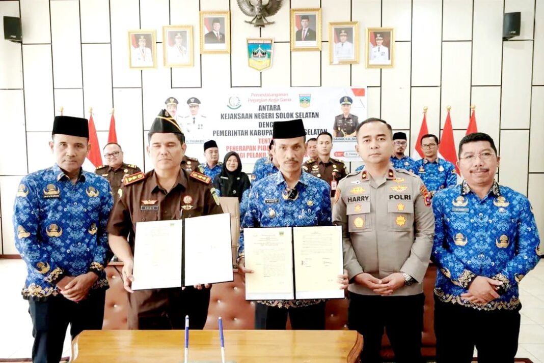 Solsel, dutametro.com — Pemerintah Kabupaten Solok Selatan dan Kejaksaan Negeri Solok Selatan resmi menandatangani Perjanjian Kerja Sama tentang Penerapan Pidana Kerja Sosial bagi Pelaku Tindak Pidana, Senin (01/12/2025) di Aula Kantor Bupati.