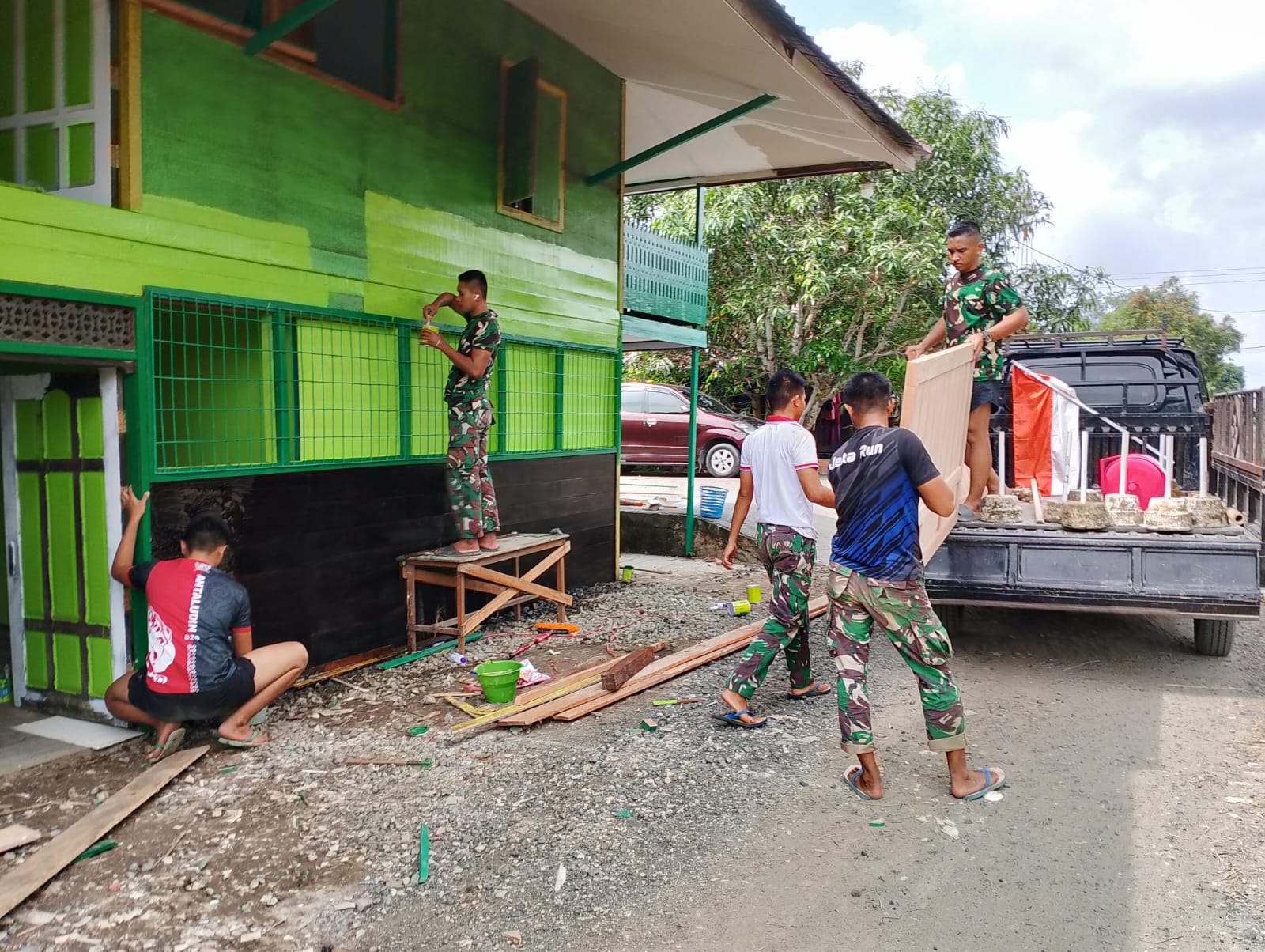 Di bawah terik matahari, anggota Satgas TMMD bersama warga bahu-membahu menyempurnakan bangunan TPA dengan memasang lis jendela dan mengecat dinding. Setiap sapuan kuas dan setiap paku yang terpasang bukan sekadar pekerjaan fisik, tetapi wujud kepedulian agar anak-anak dapat belajar mengaji dengan lebih nyaman dan aman.