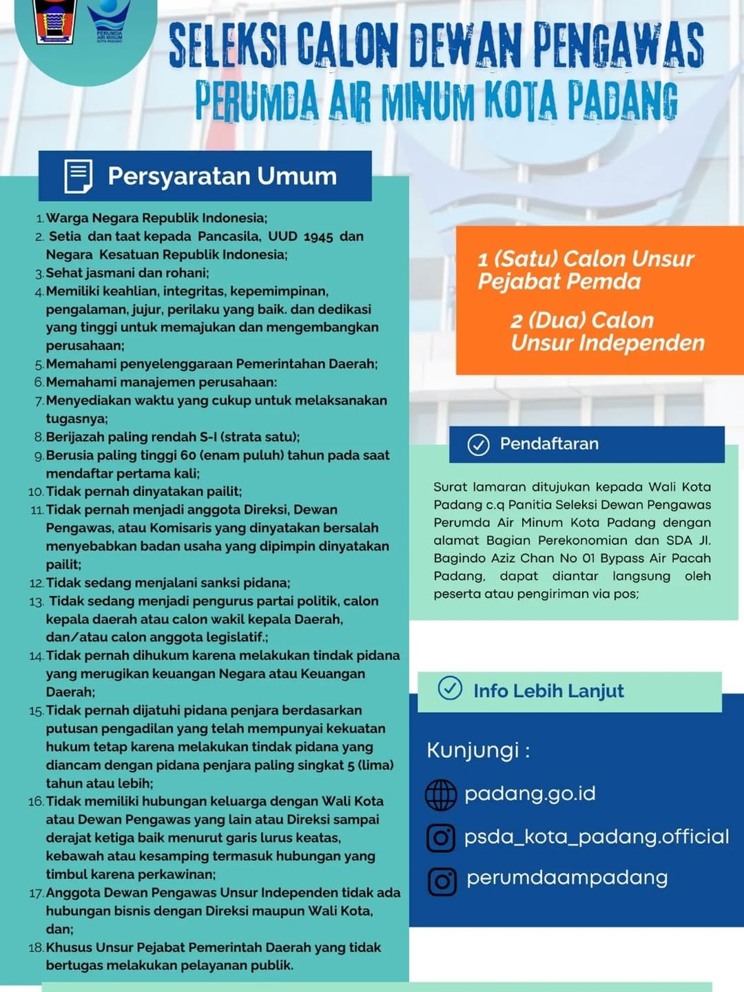Pendaftaran dilakukan dengan mengirimkan berkas lamaran yang ditujukan kepada Wali Kota Padang c.q. Panitia Seleksi Dewan Pengawas Perumda Air Minum Kota Padang.