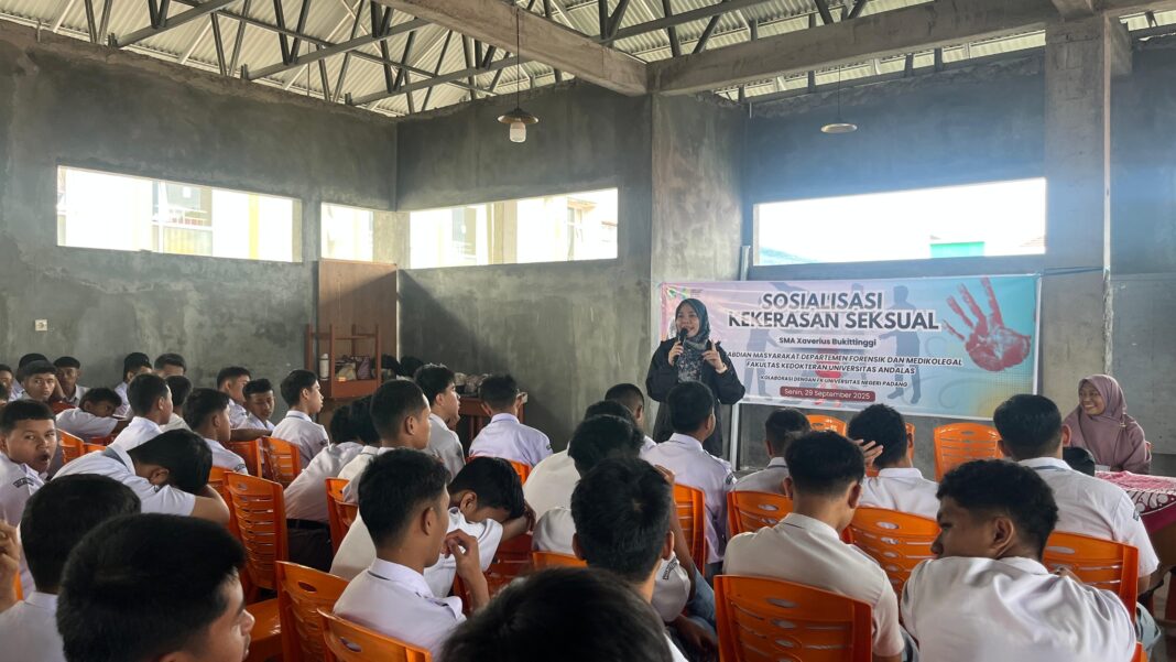 Bukittinggi, dutametro.com- Departemen Forensik dan Medikolegal Fakultas Kedokteran Universitas Andalas (UNAND) bekerja sama dengan Fakultas Kedokteran Universitas Negeri Padang (UNP) menggelar sosialisasi tentang kekerasan seksual di SMA Xaverius Bukittinggi, Sumatera Barat, Senin (29/9). Kegiatan ini bertujuan untuk meningkatkan kesadaran mengenai bahaya kekerasan seksual dan pentingnya perlindungan serta pencegahan, khususnya di kalangan generasi muda.