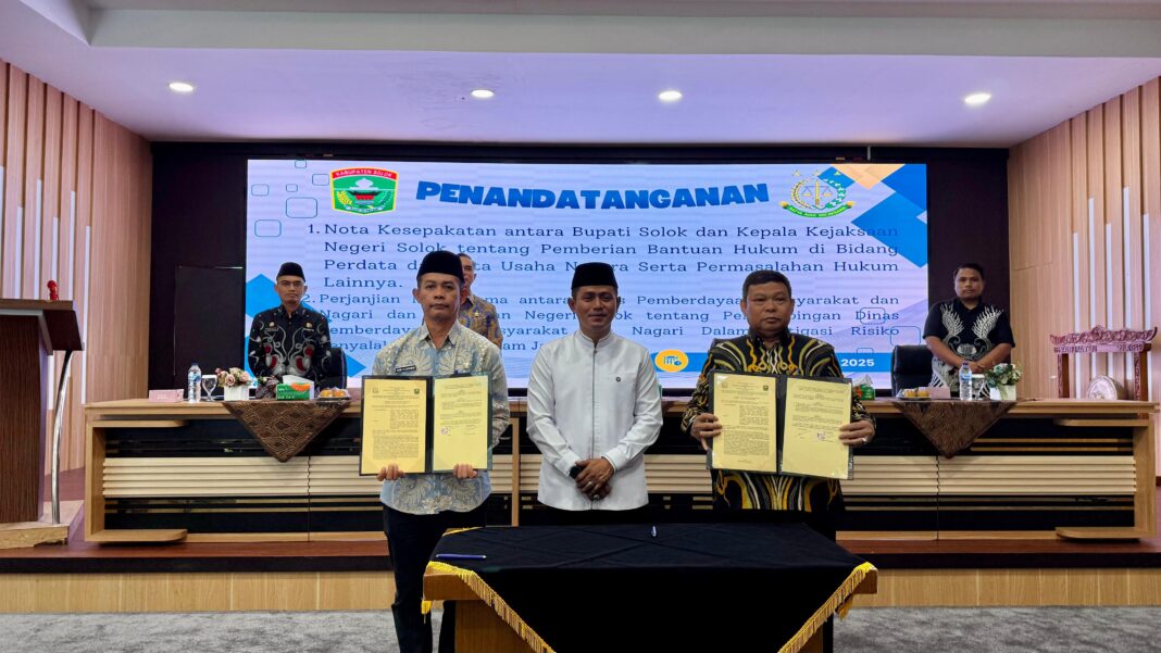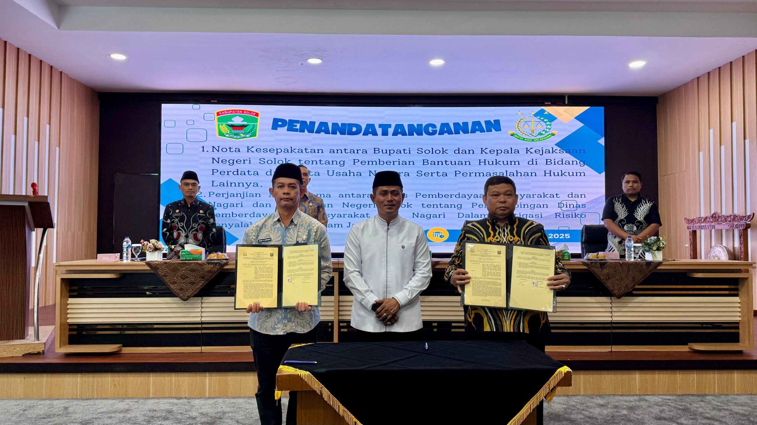 Arosuka, dutametro.com-Pemerintah Kabupaten Solok bersama Kejaksaan Negeri Solok menandatangani Nota Kesepakatan dan Perjanjian Kerja Sama terkait pemberian bantuan hukum di bidang perdata, tata usaha negara, serta pembimbingan dalam program Jaga Nagari. Kegiatan ini berlangsung di Aula Gedung C, Sekretariat Daerah Kabupaten Solok, pada Jumat(03/10/2025).