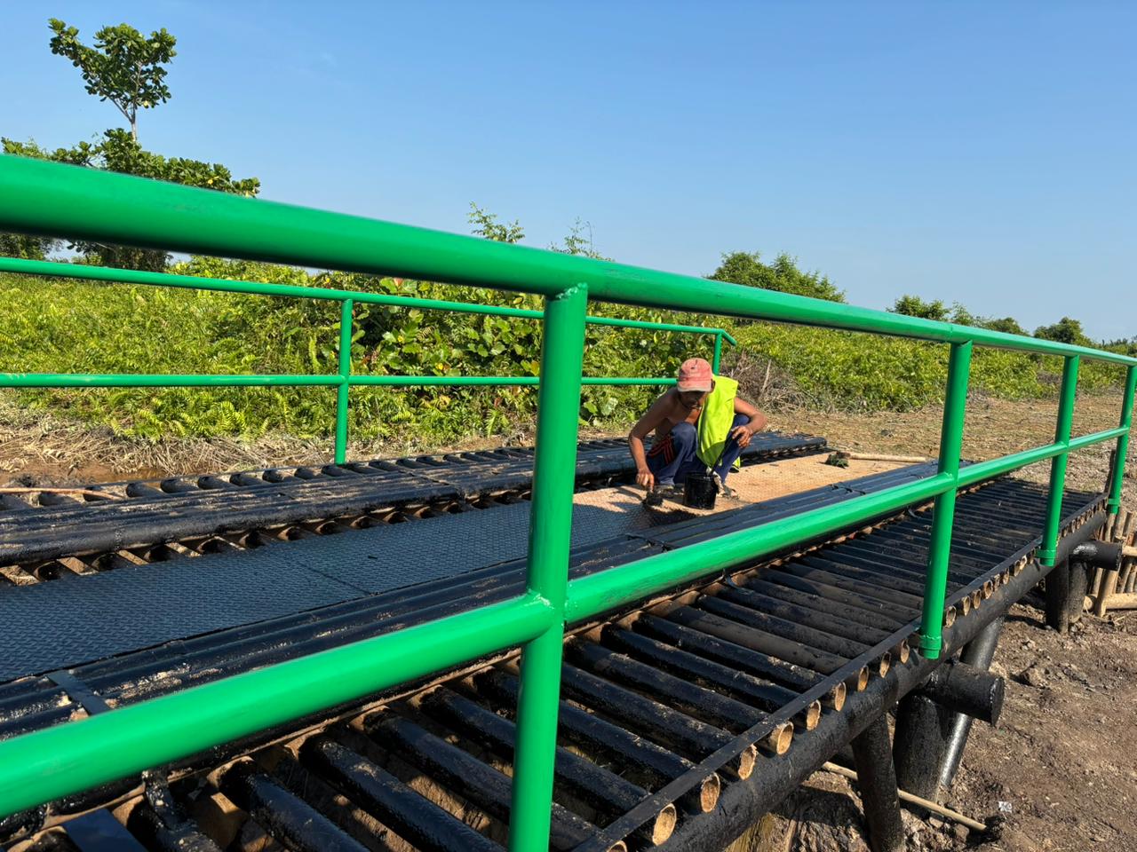 Beberapa prajurit terlihat fokus pada pemasangan landasan dan pengecatan pagar jembatan dengan warna hijau mencolok, sementara yang lain memastikan struktur besi tersambung kuat. Suasana kerja diwarnai dengan semangat gotong royong dan tekad untuk segera menuntaskan proyek ini.