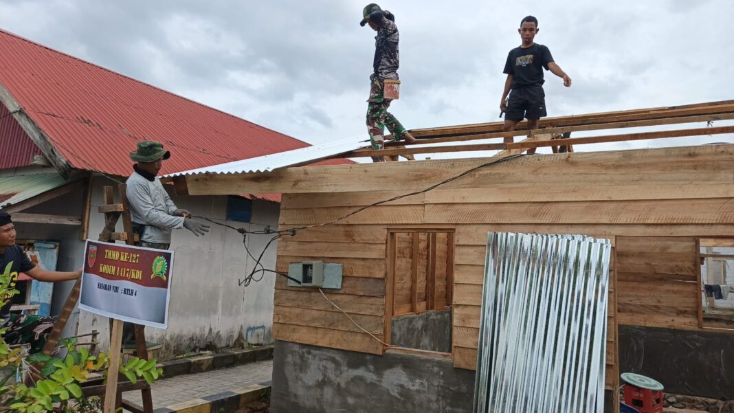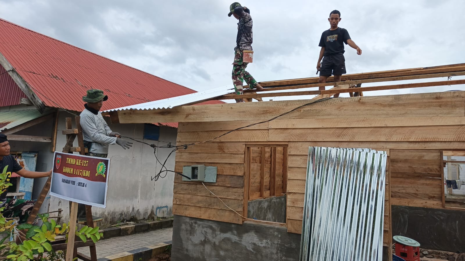 Personel TNI bersama warga setempat tampak bahu-membahu menaikkan dan memaku lembaran seng ke rangka rumah yang telah berdiri kokoh.