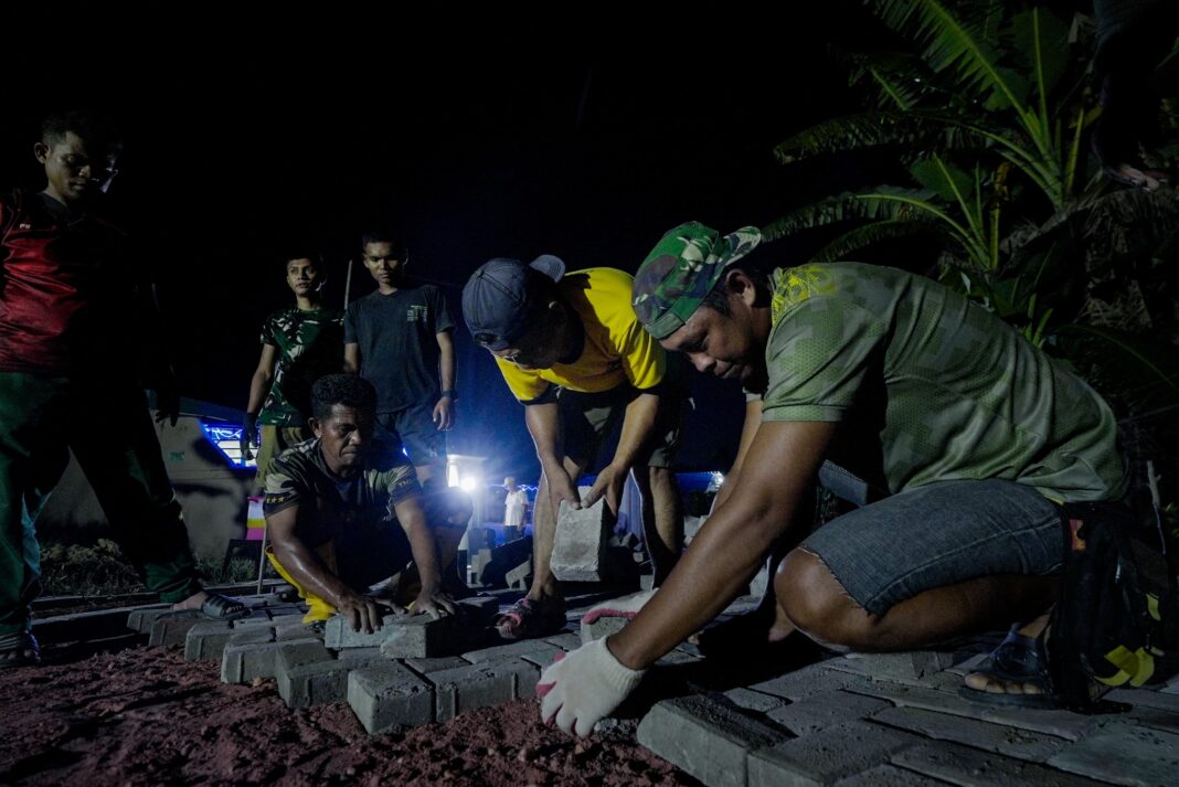 Pemandangan ini bukan sekadar pengerjaan infrastruktur fisik, melainkan manifestasi nyata dari kemanunggalan TNI dan rakyat yang tetap menyala meski di tengah kesunyian malam.