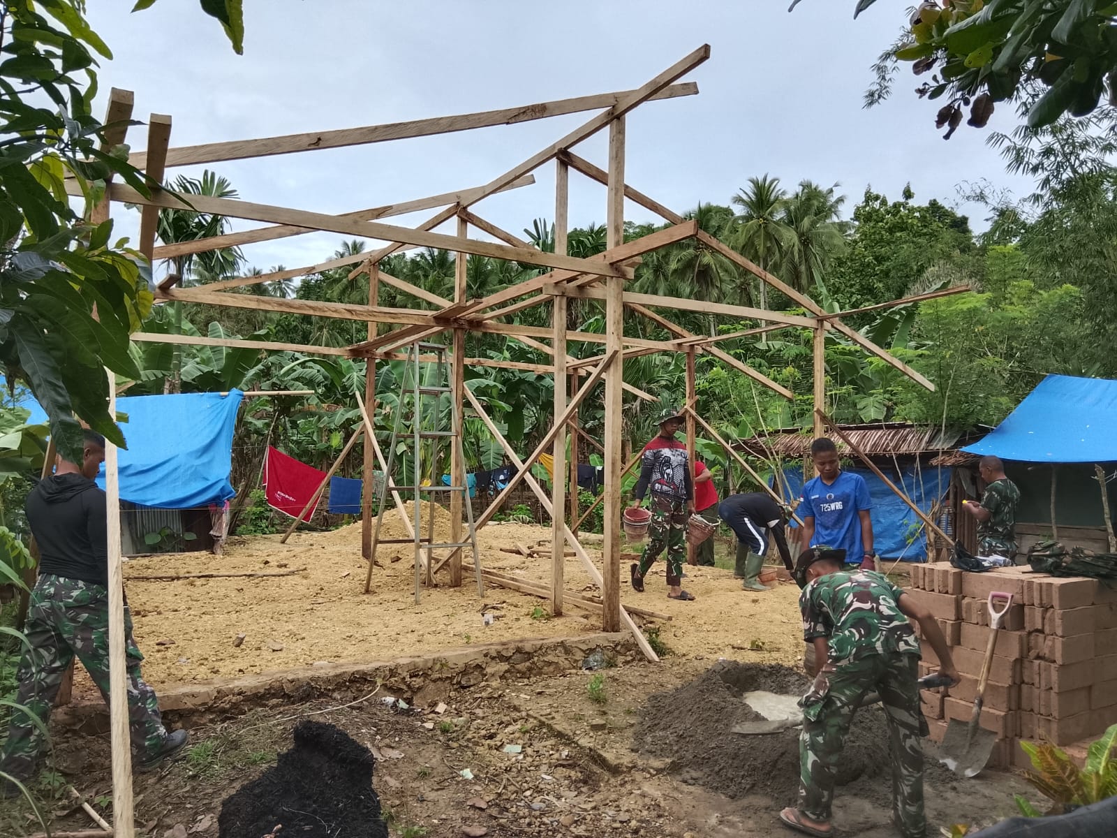 ​Satuan Tugas (Satgas) TMMD terus bekerja dengan penuh dedikasi untuk memastikan setiap detail rangka rumah dibangun sesuai standar kelayakan bangunan.