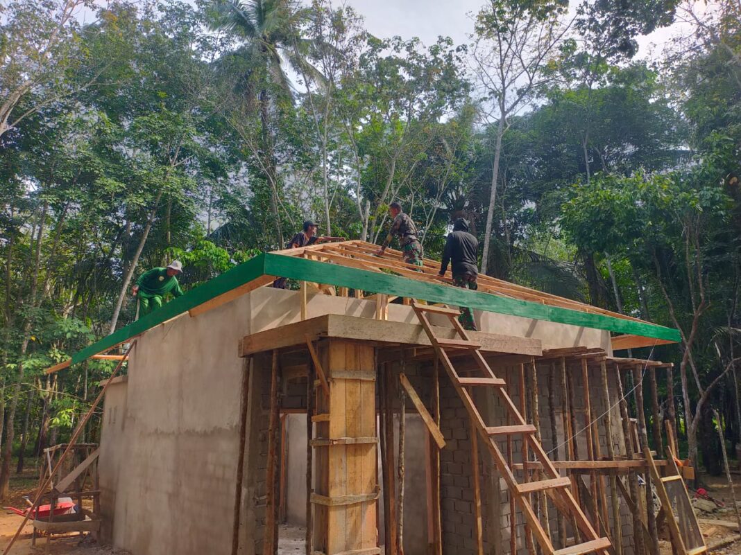 Kuantan Singingi – Pembangunan rumah layak huni milik Bapak Hamidan di Dusun 1, Desa Tanjung, Kecamatan Kuantan Hilir Seberang, Kabupaten Kuantan Singingi, terus menunjukkan kemajuan yang signifikan. Pada hari Rabu, 4 Maret 2026, tim Satgas TMMD ke-127 Kodim 0302/Inhu melaksanakan kegiatan pemasangan kayu rangka atap sebagai bagian dari proses pembangunan rumah yang ditargetkan selesai dalam waktu dekat.