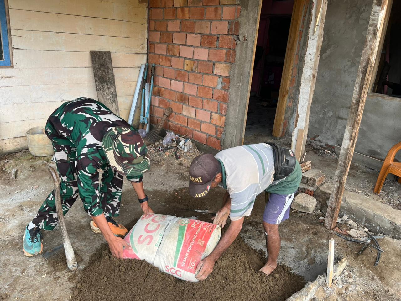 Dengan semangat gotong royong dan kebersamaan, para prajurit dan warga saling bahu-membahu melakukan pekerjaan plester dinding agar hasilnya rapi dan kuat. Pekerjaan ini dilakukan secara teliti dan penuh perhatian, agar bangunan rumah yang sedang dibangun dapat segera selesai dan layak huni.