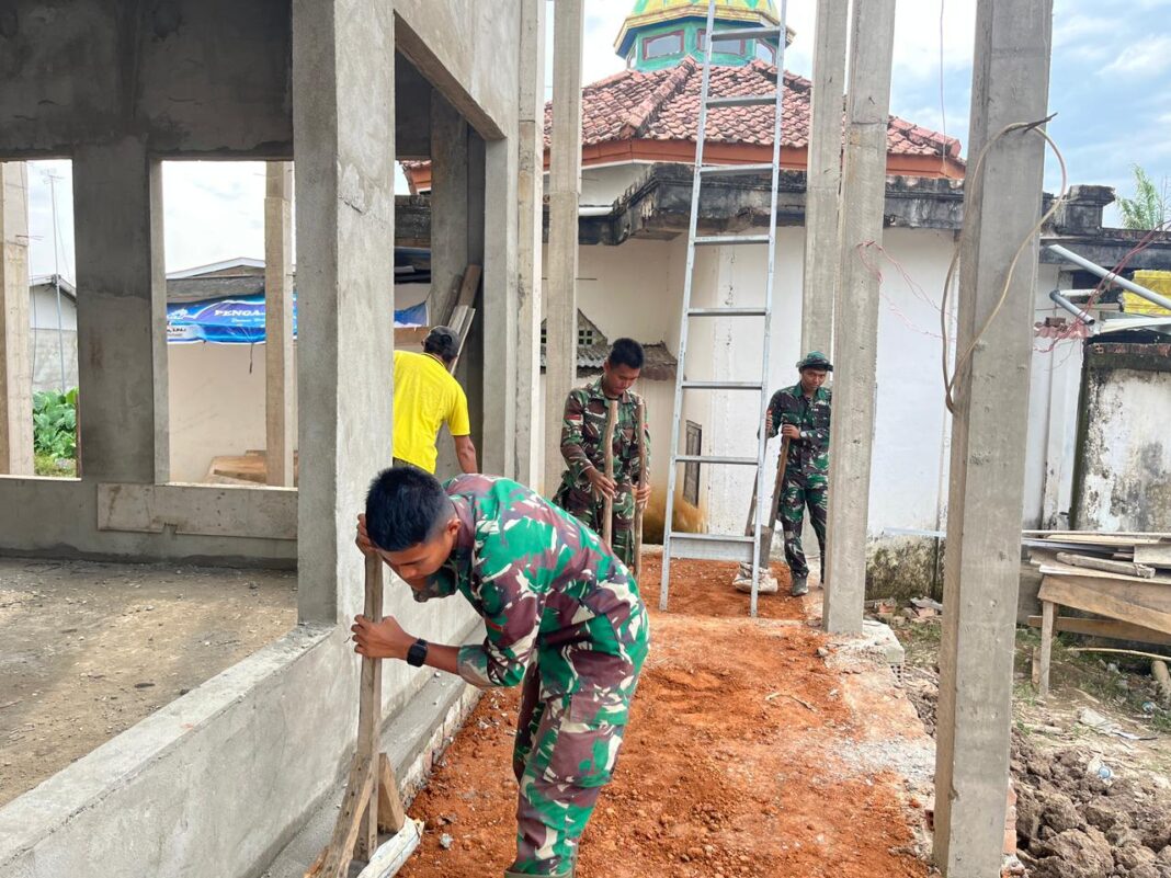 Satgas TMMD 127 Kodim 0430/Banyuasin Bersama Masyarakat Tuntaskan Penimbunan Tanah di Sekitar Masjid Jami Darusalam