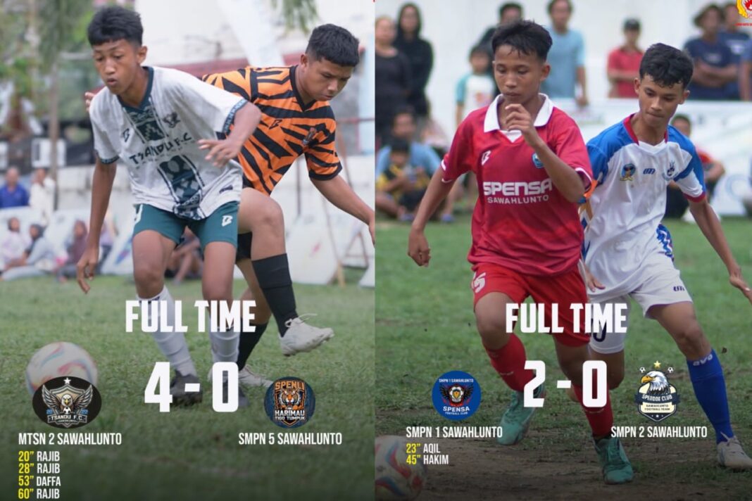 Sawahlunto, dutametro.com -Madrasyah Tsanawiyah Negeri (MTsN) 2 dan SMPN 1 Sawahlunto berhasil melaju ke babak semifinal liga Askot PSSI Sawahlunto tingkat SLTP sederajat. MTsN 2 berhasil menumbangkan SMPN 5 dengan skor mentereng (4 – 0), sedangkan SMPN 1 menang 2 – 0 atas SMPN 2 Sawahlunto dilaga perempat final, Jumat (03/10/2025).