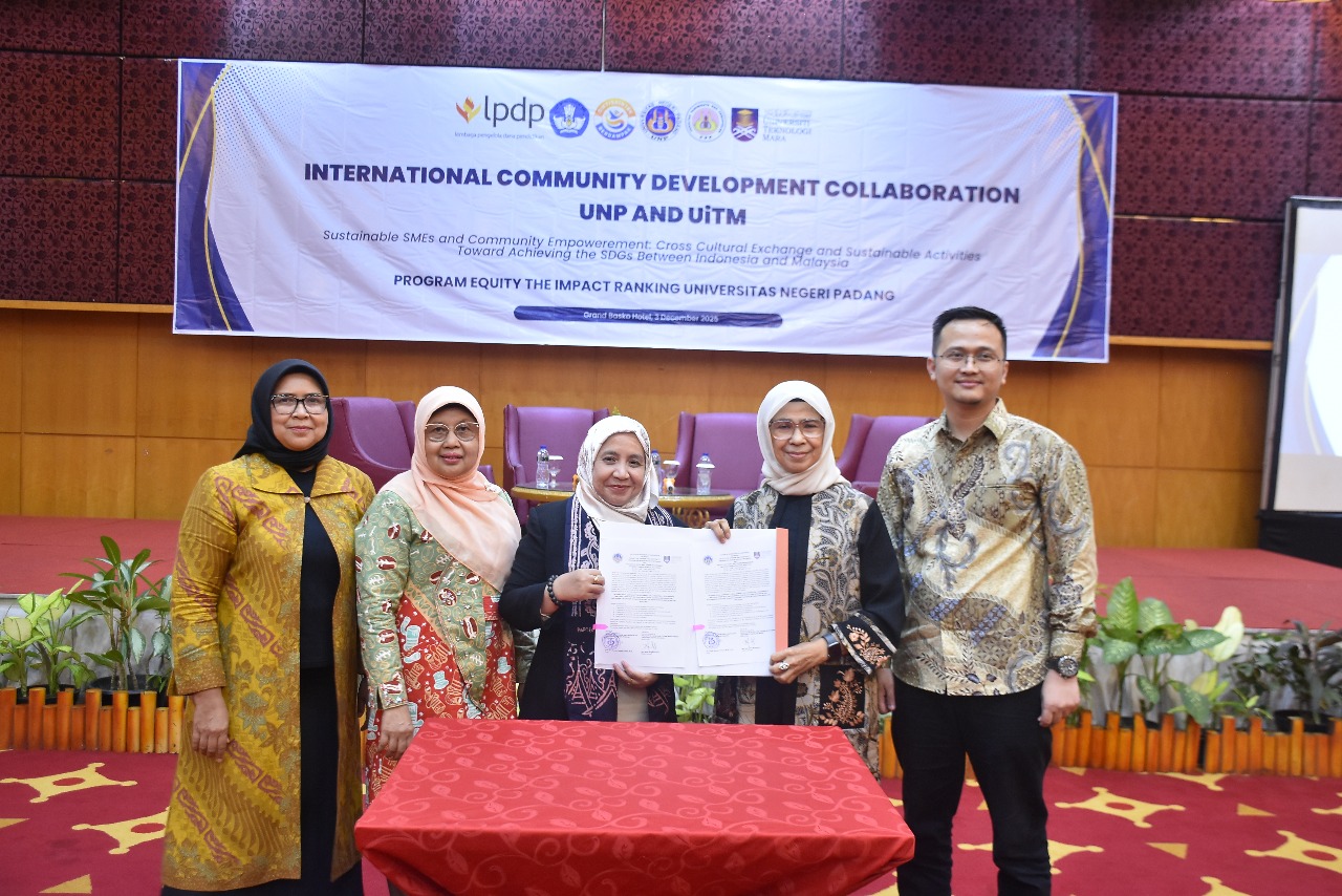 Padang, 3 Desember 2025 — Universitas Negeri Padang (UNP) bersama Universiti Teknologi MARA (UiTM) Malaysia sukses menyelenggarakan International Community Development Collaboration bertema “Sustainable SMEs and Community Empowerment: Cross-Cultural Exchange and Sustainable Activities Toward Achieving the SDGs Between Indonesia and Malaysia” di Grand Basko Hotel, Padang.