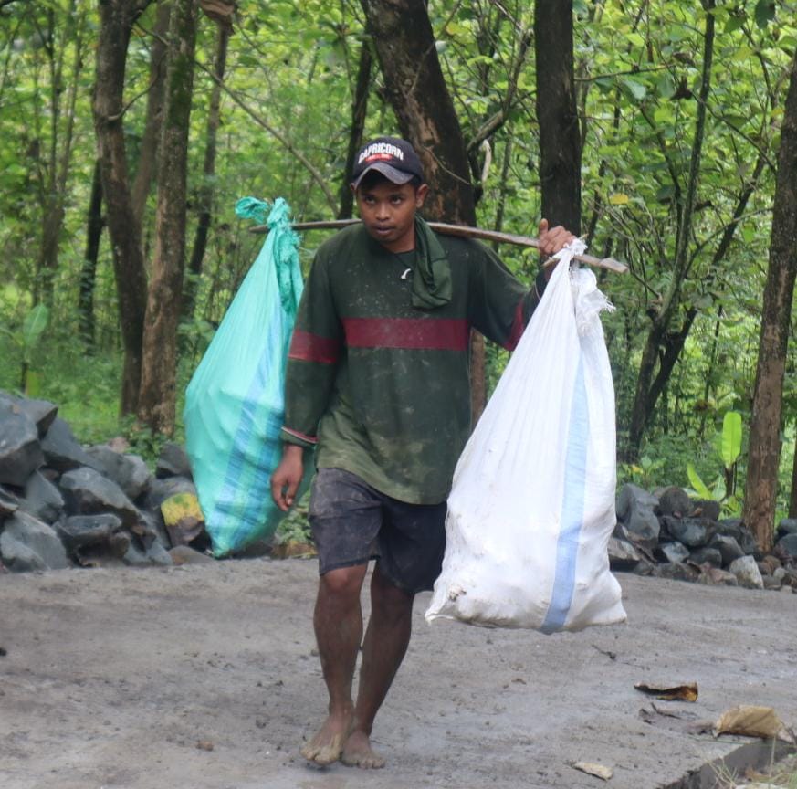 “Oh iya Pak, dipikul cuma sampai depan situ saja. Nanti diangkut pakai mobil. Soalnya kalau dibawa sampai sini (titik beton terbaru) belum boleh, karena cornya masih baru, harus dijaga dulu,” jawab Rawid dengan penuh kesadaran.