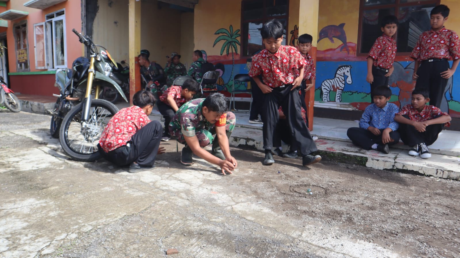 Bukan sedang memberikan pengarahan formal, Kopka Sigit justru terlihat jongkok bersama para siswa untuk bermain kelereng. Momen ini terjadi saat jam istirahat sekolah, di mana lokasi SDN Cikuya 1 memang terletak berdekatan dengan Pos Komando Taktis (Poskotis) TMMD.