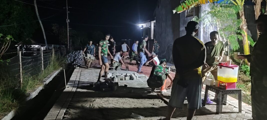 Meski hari telah gelap, para prajurit bersama warga setempat tetap bahu-membahu melaksanakan kerja lembur untuk memasang paving blok sepanjang 70 meter.