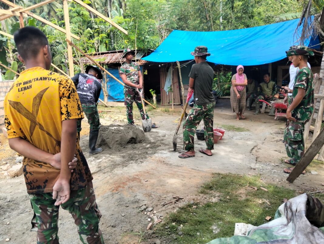 Di bawah terik matahari, personel Satgas TMMD bersama masyarakat bahu-membahu merampungkan pembangunan Rumah Tidak Layak Huni (RTLH) yang menjadi salah satu sasaran unggulan KASAD.