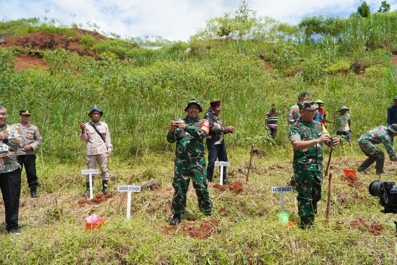 Dalam rangka memperkuat kepedulian terhadap lingkungan, Brigjen TNI Andiek Prasetyo Awibowo selaku Staf PJO TMMD bersama Tim Wasev dan jajaran Forkopimda turut menanam pohon Indigofera dan Kaliandra sebanyak 1.000 batang di wilayah Somagede. Satu per satu bibit ditanam di tanah desa, seakan menjadi simbol harapan baru—bahwa TMMD tidak hanya membangun hari ini, tetapi juga menanam kehidupan bagi masa depan.