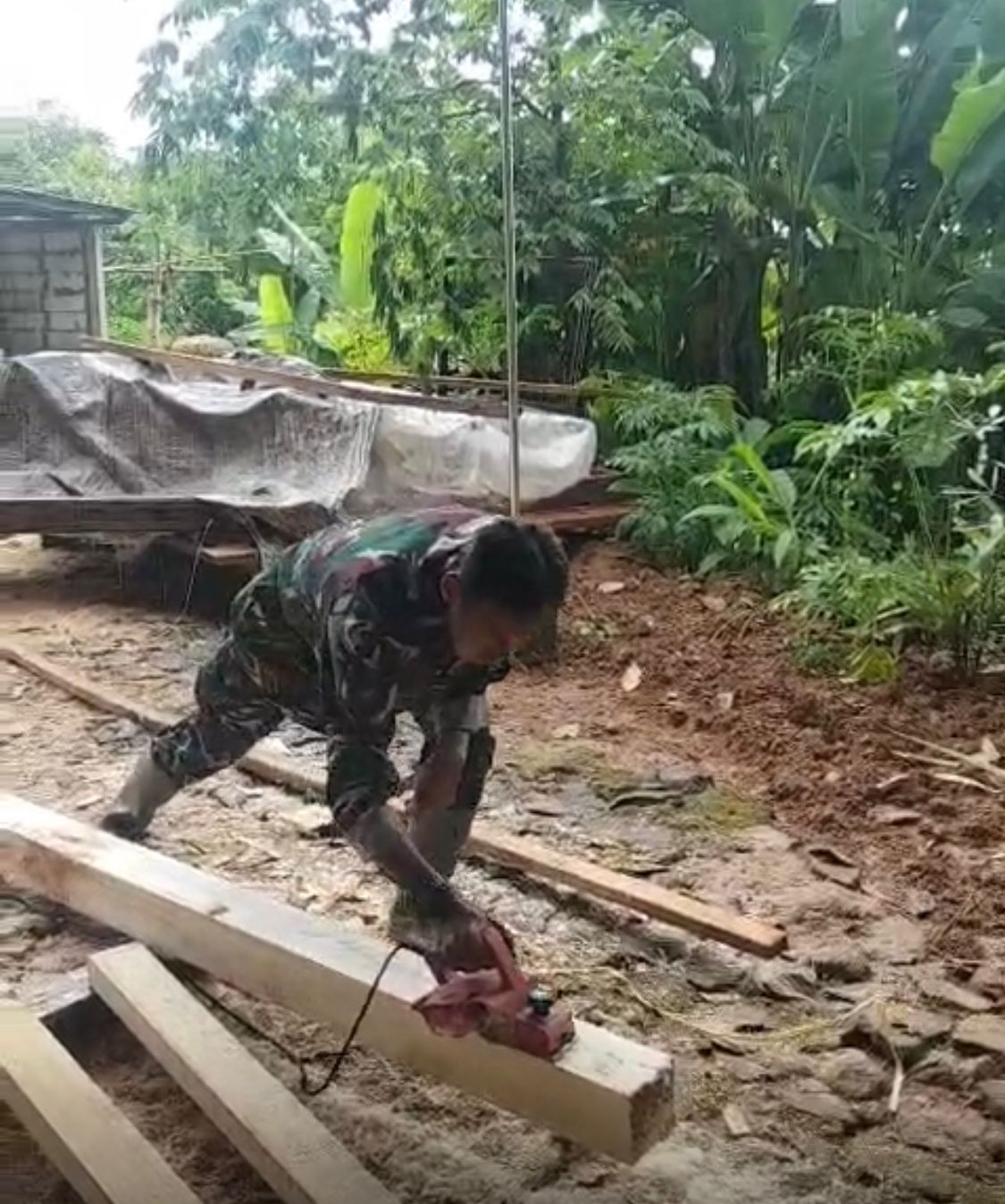 Seperi yang dilakukan Serka Suranto, Prajurit yang pernah berdinas di Komando Pasukan Khusus (Kopasus) sangat piawai menghaluskan permukaan kayu yang tidak rata untuk merakit kayu yang akan untuk atap rumahdengan menuggunakan mesin serut kayu.