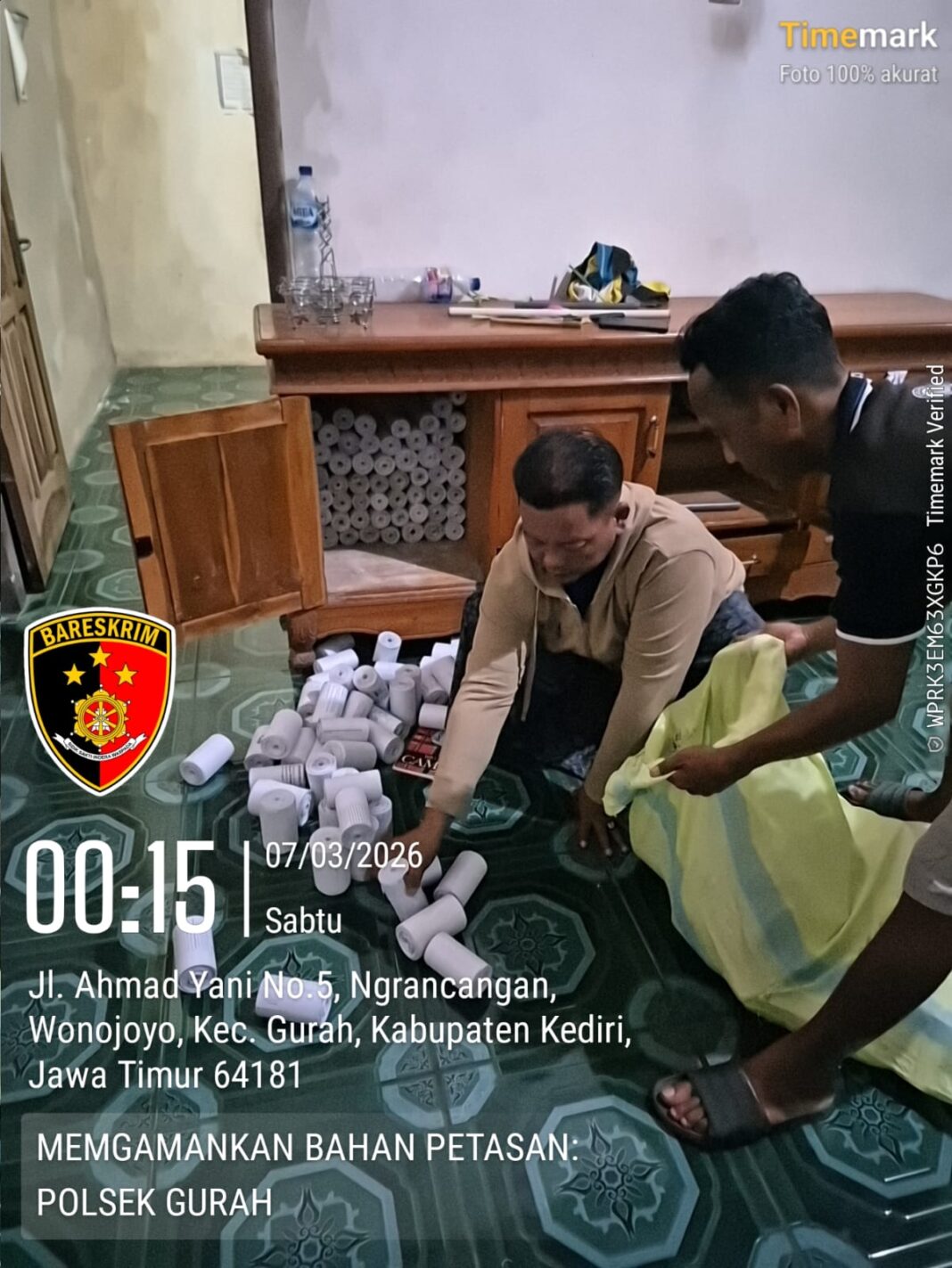Kegiatan tersebut berlangsung pada Sabtu (7/3/2026) dini hari, di Dusun Aru-aru, Desa Wonojoyo, Kecamatan Gurah, Kabupaten Kediri. Dalam kegiatan itu, petugas berhasil mengamankan ratusan selongsong petasan yang diduga akan digunakan untuk produksi petasan rakitan.