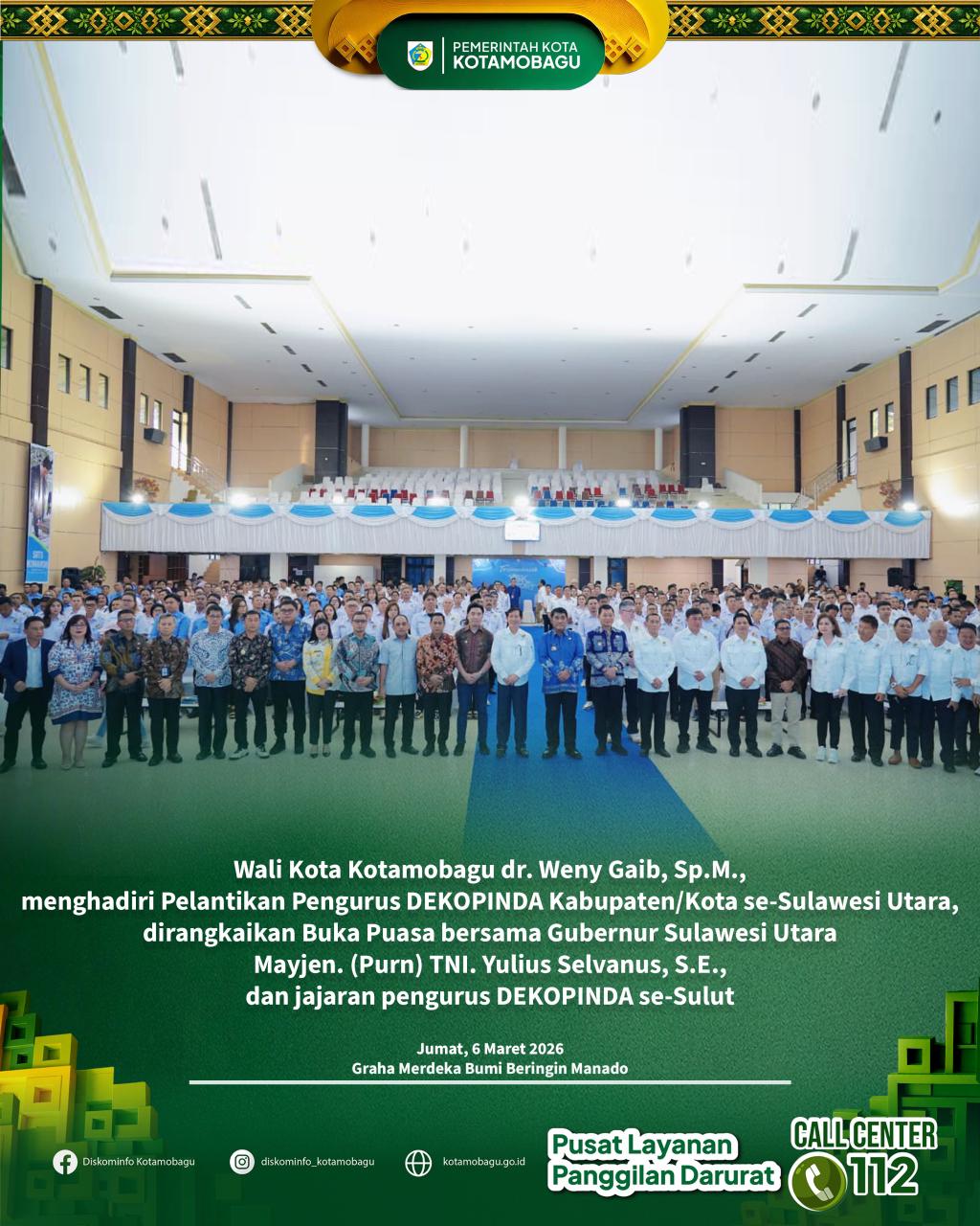 Manado-Dutametro.com-Wali Kota Weny Gaib menghadiri pelantikan Pimpinan Dewan Koperasi Indonesia Daerah (Dekopinda) Kabupaten/Kota se-Provinsi Sulawesi Utara yang digelar di Graha Gubernuran Bumi Beringin, Manado, Jumat (6/3/2026).