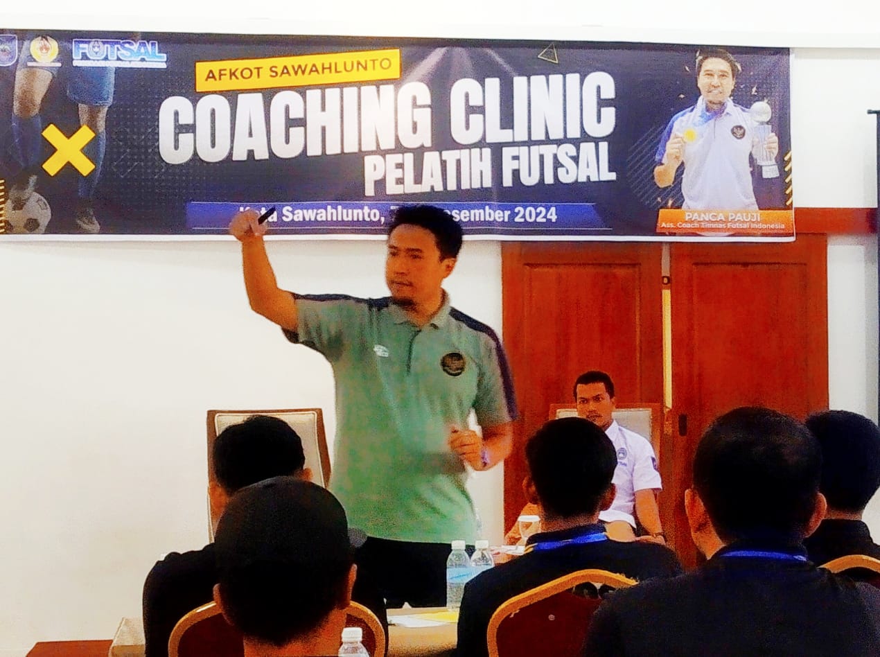 orang pelatih Futsal dan guru olahraga SMP/MTS se Kota Sawahlunto, Sabtu (7-8/12/2024). Kegiatan berbentuk coaching clinic itu digelar oleh Asosiasi Futsal Kota (AFKot) Sawahlunto di Khas Ombilin Hotel dan Lapangan Futsal Monev Talawi Mudik.