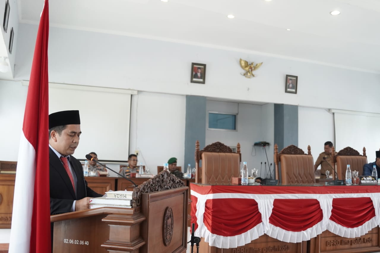Lima Puluh Kota, Dutametro.com– Pembangunan Kabupaten Lima Puluh Kota 20 tahun kedepan yang dituangkan dalam RPJPD (Rencana Pembangunan Jangka Panjang Daerah) 2025-2045 masih berfokus pada perwujudan Lima Puluh Kota madani, maju, berbudaya, dan berkelanjutan. Untuk mensukseskan visi itu, Pemerintah Kabupaten Lima Puluh Kota telah merumuskan sejumlah misi meliputi, pembangunan sumber daya manusia yang berkualitas dan berdaya saing, menciptakan transformasi ekonomi berkelanjutan, mewujudkan tata kelola yang profesional, transparan, akuntabel, dan inovatif, dan memantapkan keamanan daerah tangguh, masyarakat damai, dan inklusif. Misi lain dalam mensukseskan visi itu diantaranya memantapkan ketahahan sosial budaya, pembangunan wilayah secara merata, pembangunan sarana prasarana ramah lingkungan dan mewujudkan kesinambungan pembangunan. Demikian pokok pikiran Pjs. Bupati Lima Puluh Kota Ahmad Zakri saat menyampaikan Nota Bupati terhadap RPJPD Kab. Lima Puluh Kota 2025-2045 dan Penandatangan Pakta Integritas terhadap RPJPD Kabupaten Lima Puluh Kota antara DPRD dengan Pemerintah Daerah di Aula DPRD, Bukik Limau, Senin, (07/10/2024). Sidang yang dipimpin oleh Ketua DPRD Lima Puluh Kota Doni Ikhlas itu turut dihadiri Dandim 0306/50 Kota Letkol. Ucok Namara bersama unsur Forkopimda, Anggota DPRD, Asisten II Eki Hari Purnama, dan sejumlah Kepala Perangkat Daerah.