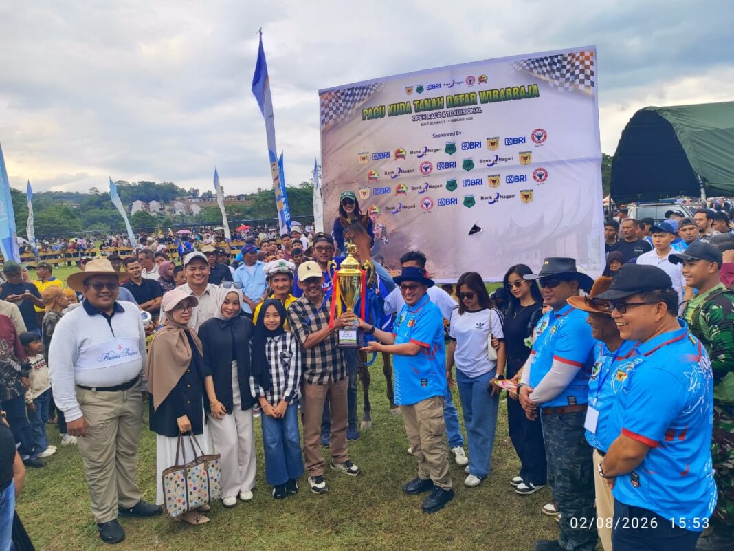 Kuda Istana Gerindra 08 Ex Freya Queen pemilik Novitra Kemala dengan joki Ridwan juara II kelas Derby jarak 1.600 meter, pada ajang pacu kuda Wirabraja Open Race dan Tradisional 2026, Minggu (08/02/2026) di Galanggang pacuan kuda Dang Tuanku Bukit Gombak Batusangkar.