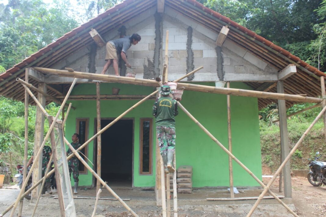 Kebumen – Semangat pengabdian Satgas TMMD Reguler ke-127 Kodim 0709/Kebumen terus mengalir dalam setiap pekerjaan. Di Desa Somagede, Kecamatan Sempor, Kabupaten Kebumen, anggota Satgas terlihat membuat stager atau perancah kerja untuk mempermudah proses plester teras bagian atas rumah tidak layak huni (RTLH) milik Bapak Ratman, Minggu (08/03/2026).