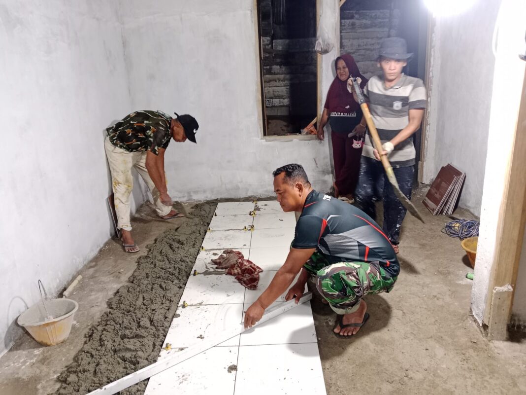 INHU– Satuan Tugas (Satgas) TNI Manunggal Membangun Desa (TMMD) Ke-127 Kodim 0302/Inhu melaksanakan kegiatan kerja malam untuk melanjutkan proses pemasangan keramik pada rumah layak huni milik Ibu Baidah di wilayah kerja Kodim. Kegiatan yang bertujuan untuk menyelesaikan pembangunan rumah tepat waktu tersebut diikuti oleh sejumlah prajurit satgas yang bekerja dengan penuh semangat meskipun dalam kondisi malam hari.