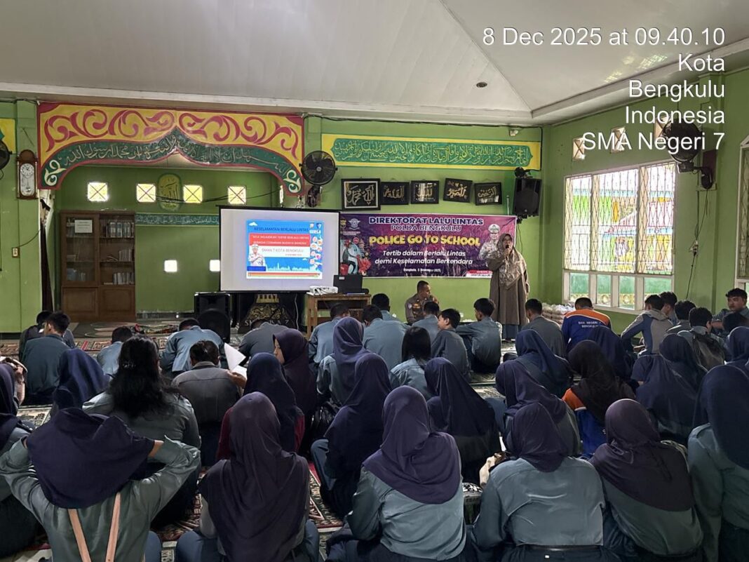 Bengkulu – Ditlantas Polda Bengkulu melalui Subdit Kamsel melaksanakan kegiatan penyuluhan dan sosialisasi tentang tertib berlalu lintas di SMA Negeri 7 Kota Bengkulu pada Senin,8 Desember 2025. Kegiatan ini bertujuan untuk memberikan edukasi kepada siswa-siswi tentang pentingnya tertib berlalu lintas sebagai cerminan budaya bangsa dan keselamatan di jalan raya.