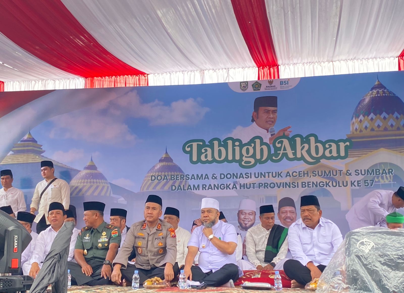 Kegiatan Tabligh Akbar dan Doa Bersama ini merupakan salah satu rangkaian kegiatan dalam memperingati HUT ke-57 Provinsi Bengkulu. Kegiatan ini dihadiri oleh Gubernur Helmi Hasan, Kapolda Bengkulu, Forkopimda serta Ketua Baznas Provinsi Bengkulu dan juga berbagai elemen masyarakat, termasuk pejabat pemerintah, tokoh agama, dan masyarakat umum. kemudian dilanjutkan Tausyiah Agama Oleh H.Roma Irama dan juga penyerahan bantuan yang dipimpin oleh Gubernur Bengkulu H. Helmi Hasan untuk Korban Bencana Di Aceh ,Sumatera Utara dan Sumatera Barat.