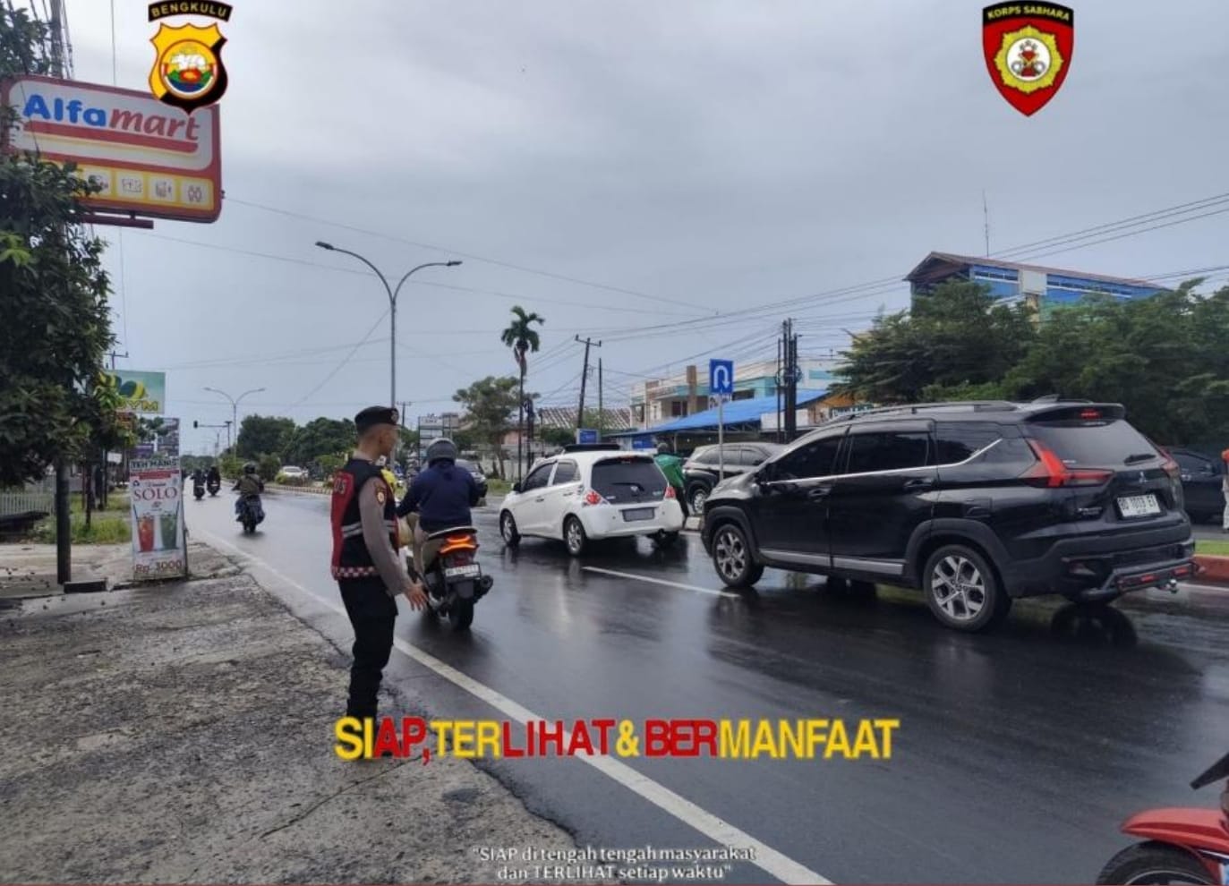 BENGKULU – Polda Bengkulu melalui personel Direktorat Lalu Lintas serta Direktorat Samapta melaksanakan kegiatan pengaturan lalu lintas pada Senin pagi (08/12/2025). Meski cuaca di Kota Bengkulu diguyur hujan dengan intensitas ringan sejak dini hari, para personel tetap sigap berada di titik-titik persimpangan utama dan kawasan rawan kemacetan demi memastikan arus kendaraan tetap lancar. Kegiatan ini merupakan bagian dari program commander wish Kapolda Bengkulu yang menekankan peningkatan pelayanan publik, khususnya pada jam-jam sibuk pagi hari.