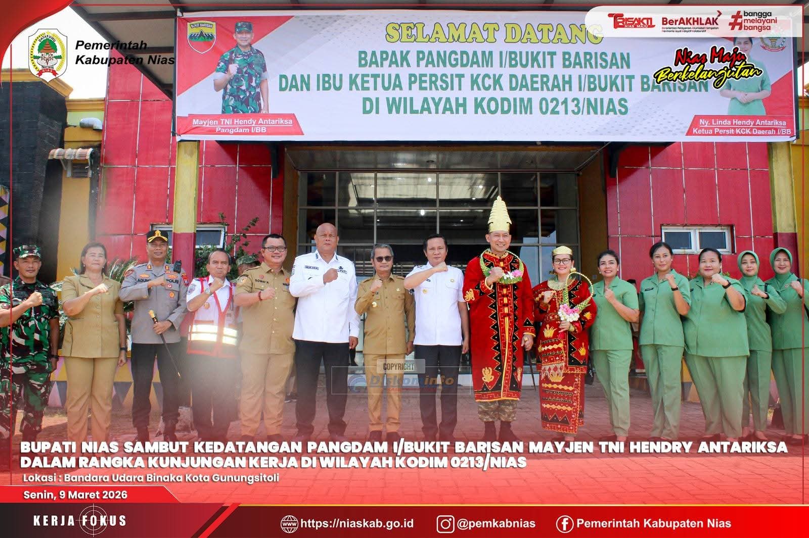 Nias, Sumatera Utara .dutametro.com.- Bupati Nias Yaatulo Gulo sambut kedatangan Pangdam I/Bukit Barisan, Hendy Antariksa, bersama Ketua Persit KCK Daerah I/Bukit Barisan, Linda Hendy Antariksa, di Bandar Udara Binaka Gunungsitoli. Senin, 09/03/2026.