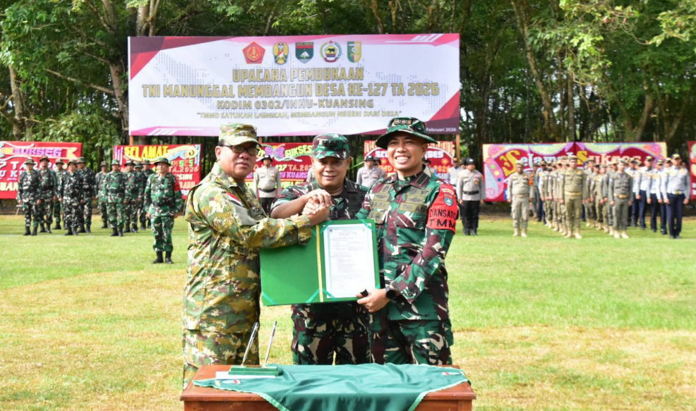 Kuansing – TNI Manunggal Membangun Desa (TMMD) ke-127 Kodim 0302/Inhu-Kuansing secara resmi dibuka dalam upacara yang berlangsung di Lapangan Bola Kaki Desa Tanjung, Kecamatan Kuantan Hilir Seberang, Kabupaten Kuansing, pada hari Selasa, 10 Februari 2026, pukul 09.00 WIB. Upacara pembukaan ini dipimpin oleh Bupati Kuansing, Dr. Suhardiman Amby, AK., MM., dan dihadiri oleh berbagai pejabat daerah, tokoh masyarakat, serta unsur TNI dan Polri.