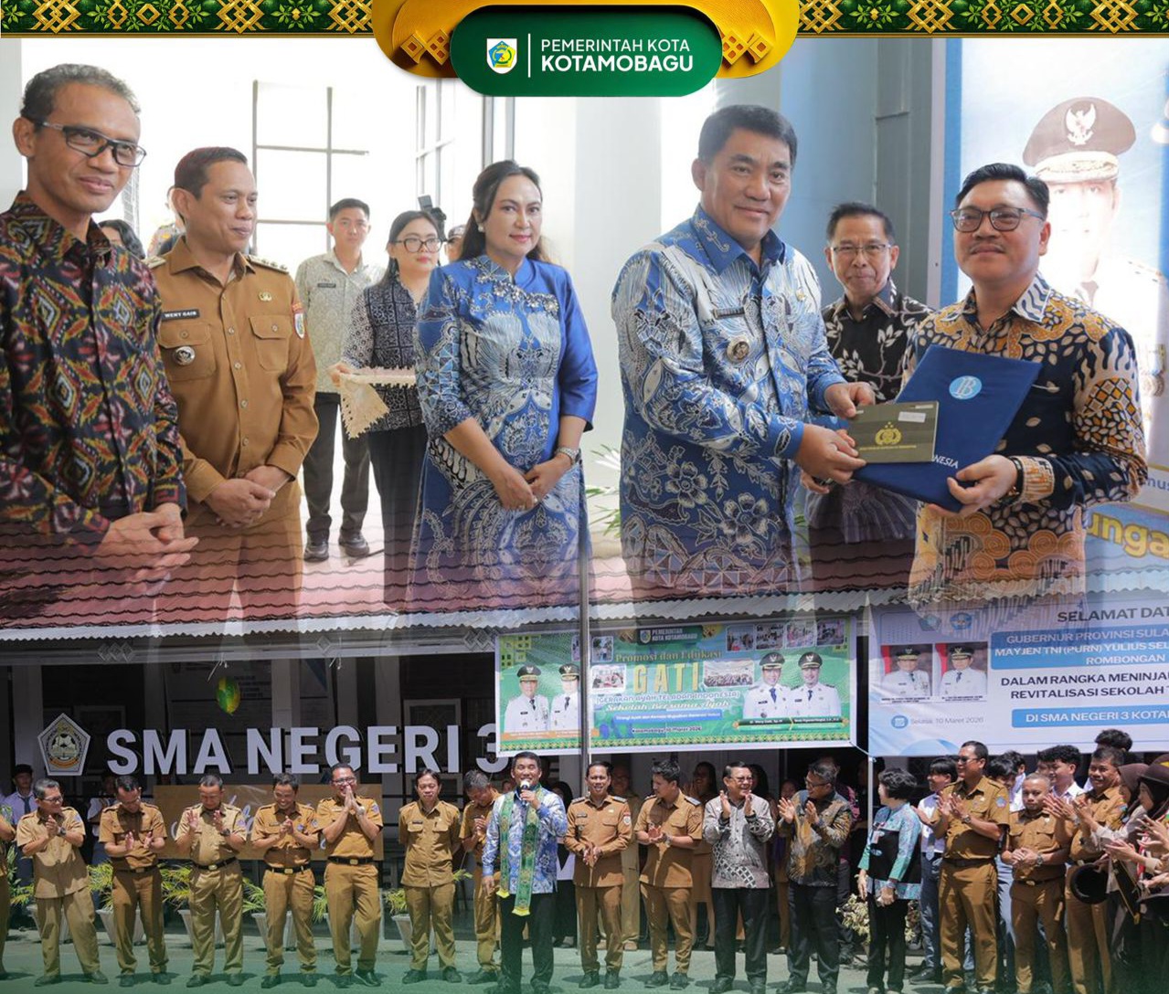 Kotamobagu,Dutametro.com – Wali Kota Kotamobagu, Weny Gaib bersama Wakil Wali Kota Rendy Virgiawan Mangkat mendampingi Gubernur Sulawesi Utara, Yulius Selvanus Komaling melakukan kunjungan kerja ke SMA Negeri 3 Kotamobagu, Selasa (10/3/2026)