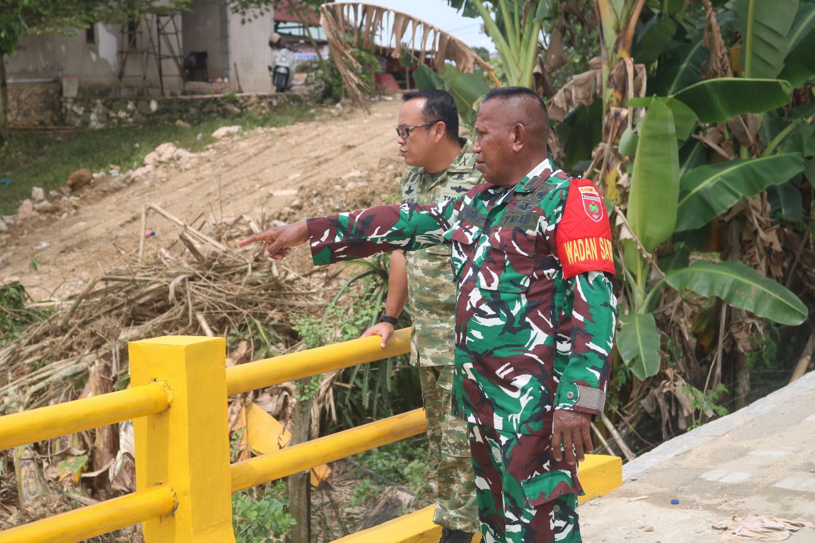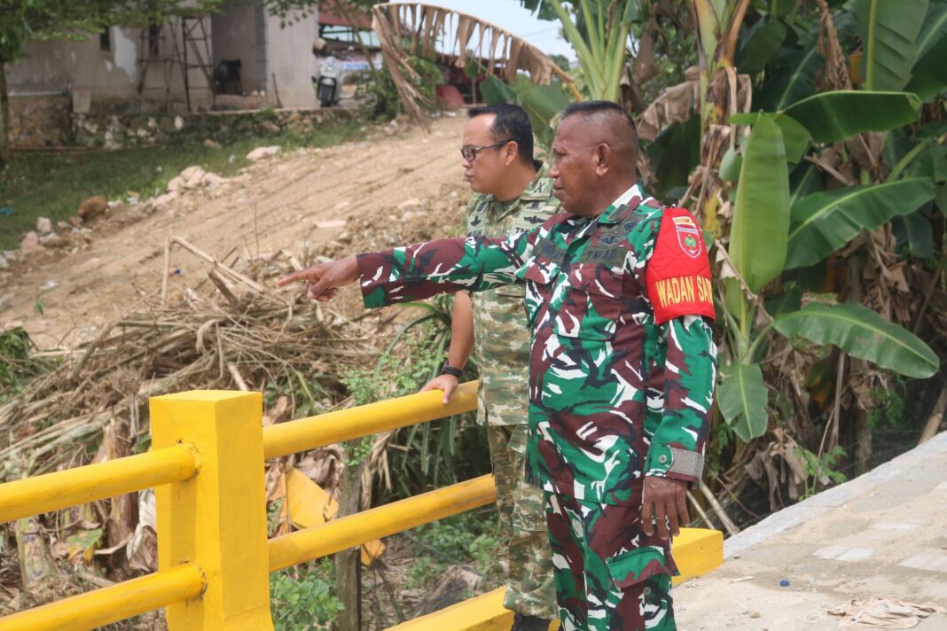 Mengenakan seragam loreng lengkap dengan ban lengan Satgas, ia tampak teliti memeriksa progres pengerjaan di lokasi, memastikan seluruh target selesai tepat waktu dan sesuai spesifikasi teknis yang telah ditentukan.