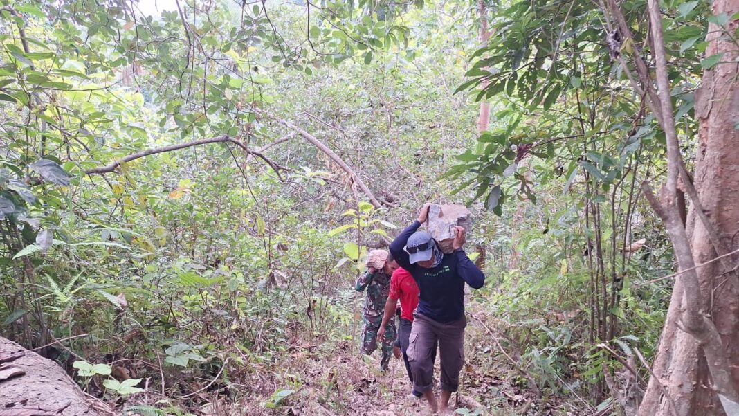 Pemandangan luar biasa terlihat saat personel TNI dan masyarakat setempat bersatu padu, membentuk barisan estafet untuk mengangkut material batu gunung menuju lokasi pembangunan bak air.