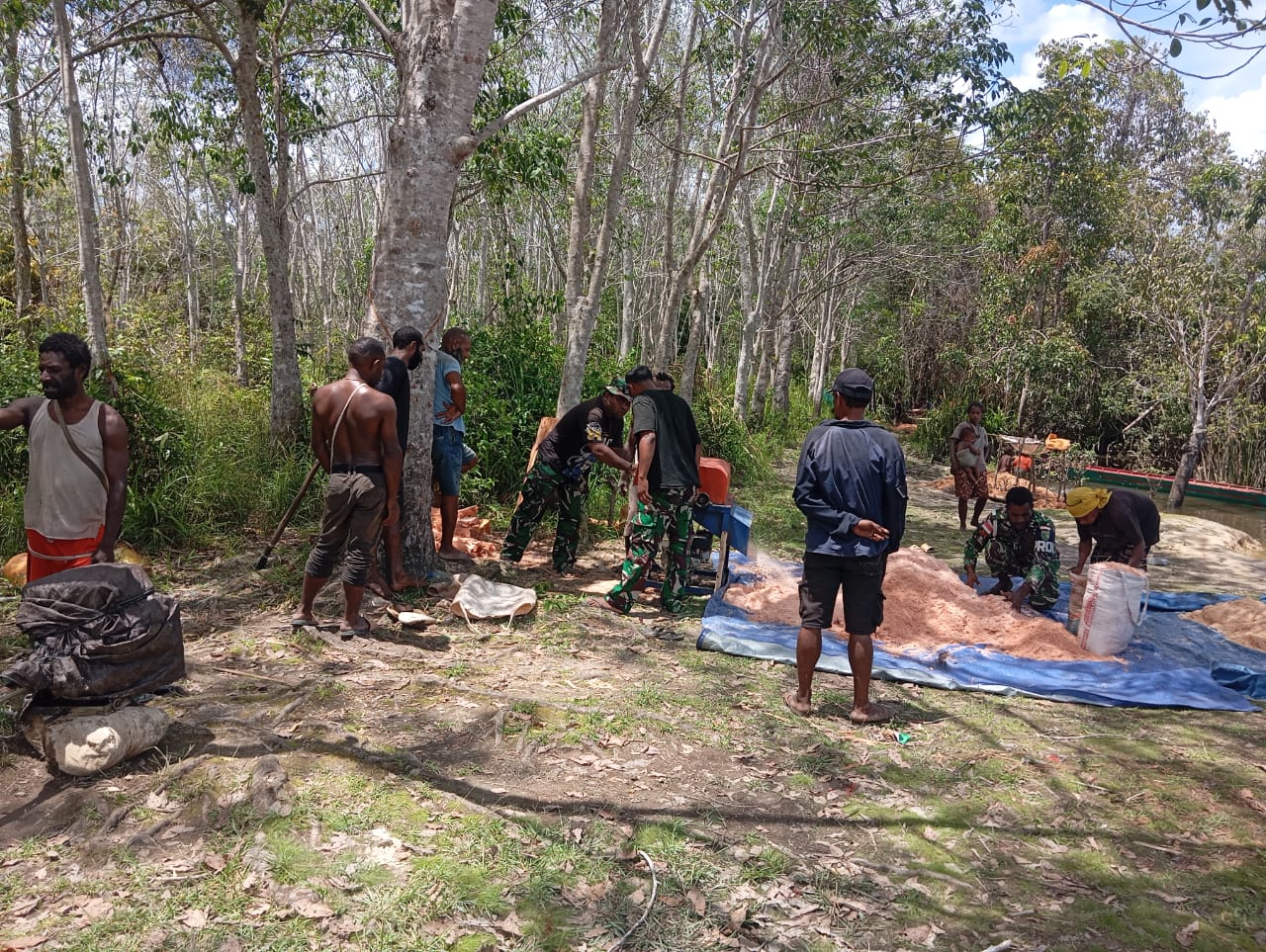 Mappi, Papua Selatan – Selain fokus pada pembangunan fisik, Satgas TMMD ke-127 Kodim 1704/Mappi juga turut serta dalam kegiatan non-fisik yang bermanfaat bagi masyarakat Kampung Yibin, yaitu membantu memproduksi sagu, bahan makanan pokok masyarakat setempat. Kegiatan ini bertujuan untuk melestarikan tradisi lokal dan meningkatkan ketahanan pangan masyarakat Kampung Yibin.