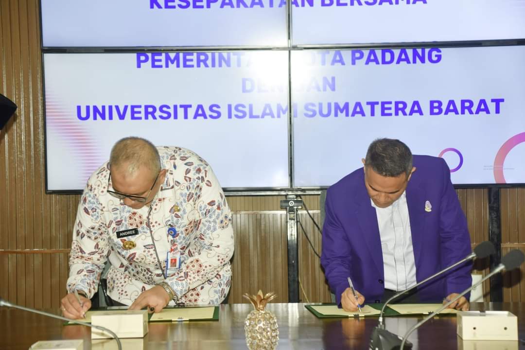 Dalam pertemuan itu, Penjabat (Pj) Wali Kota Padang Andree Algamar menandatangani Memorandum of Understanding (MoU) dengan Rektor UISB, Prof. Dr. Eka Putra Wirman, Lc., MA.