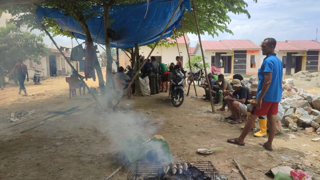 Para personel Satgas bersama warga Kelurahan Anggoeya, Kecamatan Poasia, Kota Kendari, menggelar makan siang bersama di sela-sela rutinitas pengerjaan infrastruktur.
