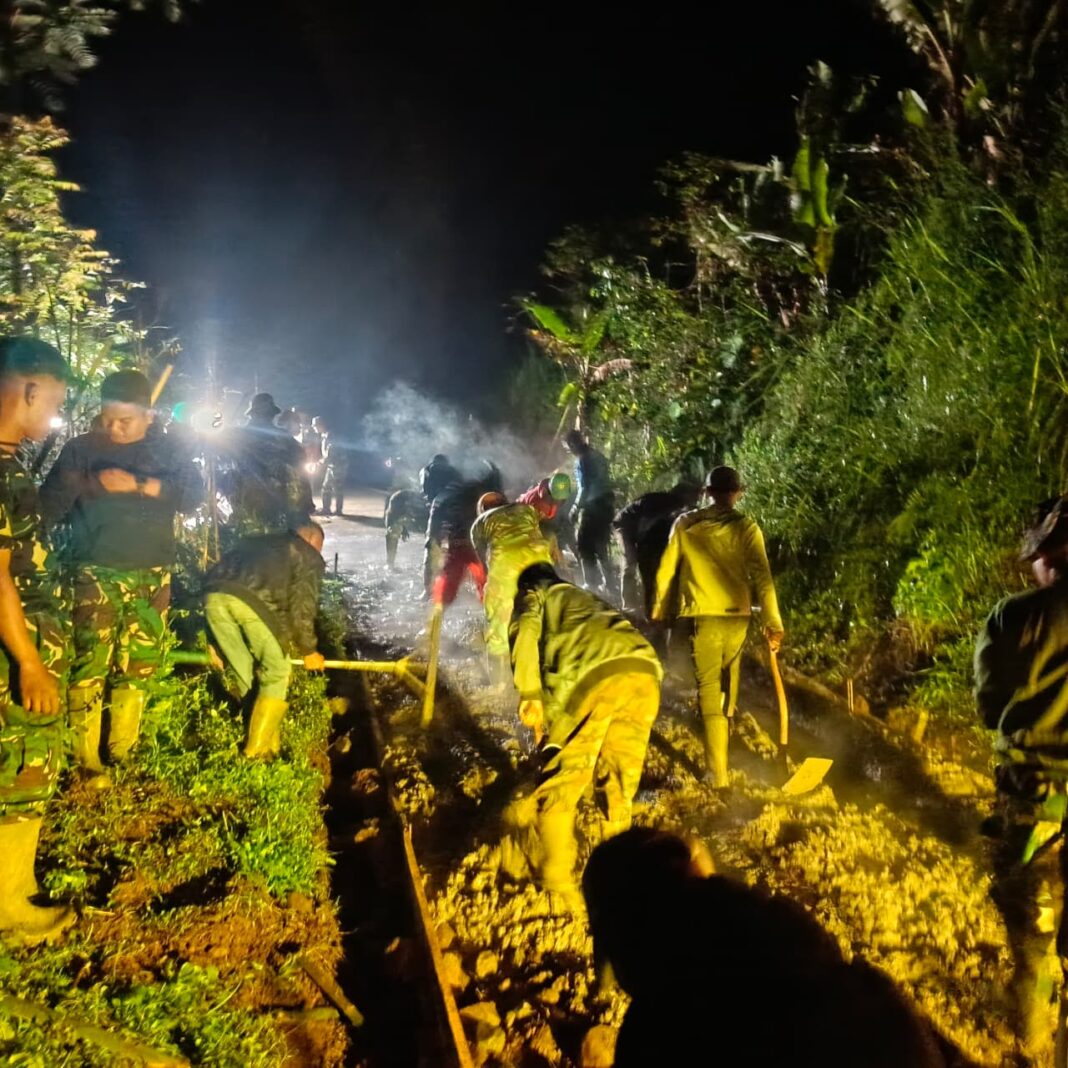 Rancabali, Kab. Bandung – Semangat membangun desa terus berkobar di Desa Cipelah, Kecamatan Rancabali, Kabupaten Bandung. Satgas TMMD Reguler ke-127 Kodim 0624/Kab. Bandung bersama masyarakat Desa Cipelah tak kenal lelah melaksanakan pengecoran jalan hingga larut malam, Rabu (11/02/2026). Kegiatan yang dimulai pukul 20.00 WIB ini merupakan upaya untuk mempercepat pencapaian sasaran fisik pengecoran jalan sepanjang 1.500 meter.
