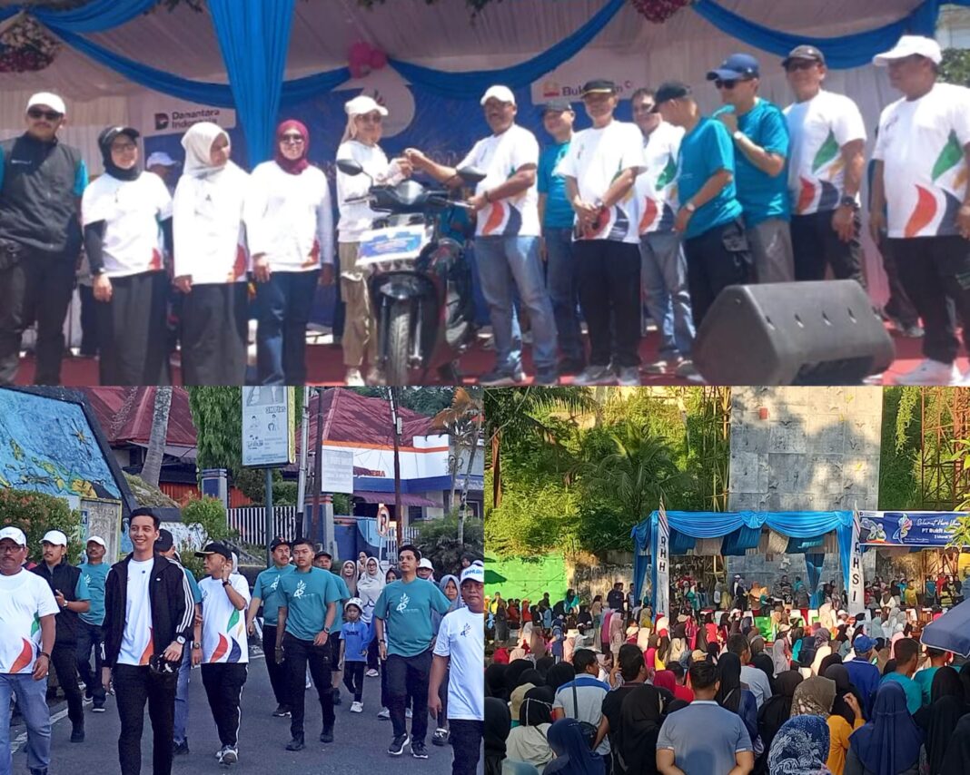 Sawahlunto,dutametro.com – Ribuan warga Sawahlunto ikuti senam bersama dan jalan santai merayakan hari ulang tahun ke 45 tahun PT. Bukit Asam (Persero) Tbk, Minggu (12/04/2026) di areal Silo Saringan. Berbagai hadiah door prize menarik disediakan panitia mulai dari peralatan dapur dan elektronik, juga ada sepeda serta hadiah utama sepeda motor. Hadir Wali Kota Sawahlunto Riyanda Putra bersama Forkopimda, Sekretaris Daerah Rovanly Abdam dan kepala OPD membaur bersama masyarakat.