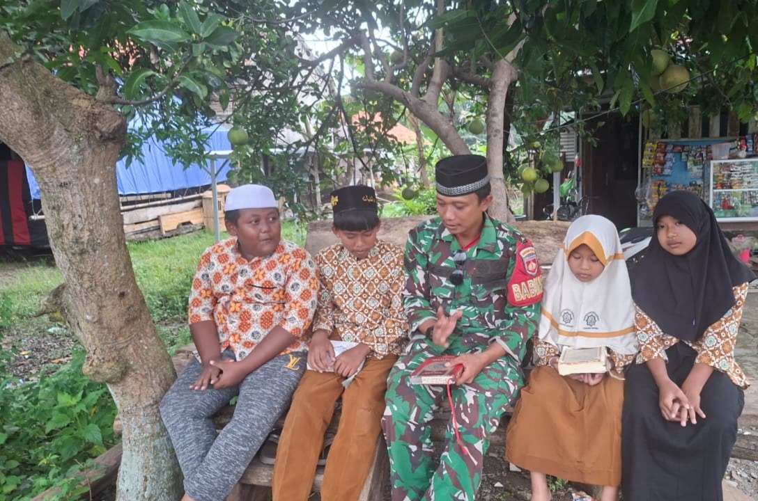 Mengenakan seragam loreng kebanggaannya, Serka Feri tampak telaten membimbing jari-jemari mungil anak-anak menelusuri huruf demi huruf hijaiyah. Suasana hangat menyelimuti kegiatan yang berlangsung sederhana namun penuh khidmat tersebut.
