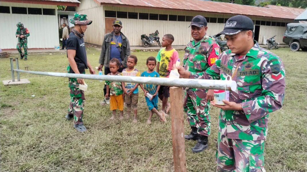 Wamena, dutametro.com– Satuan Tugas (Satgas) TNI Manunggal Membangun Desa (TMMD) ke-126 Kodim 1702/Jayawijaya kembali menunjukkan kepeduliannya terhadap dunia pendidikan melalui kegiatan pengecatan tiang bendera di SD Inpres Algonik, Distrik Pyramid, Kabupaten Jayawijaya, Senin (13/10/2025).