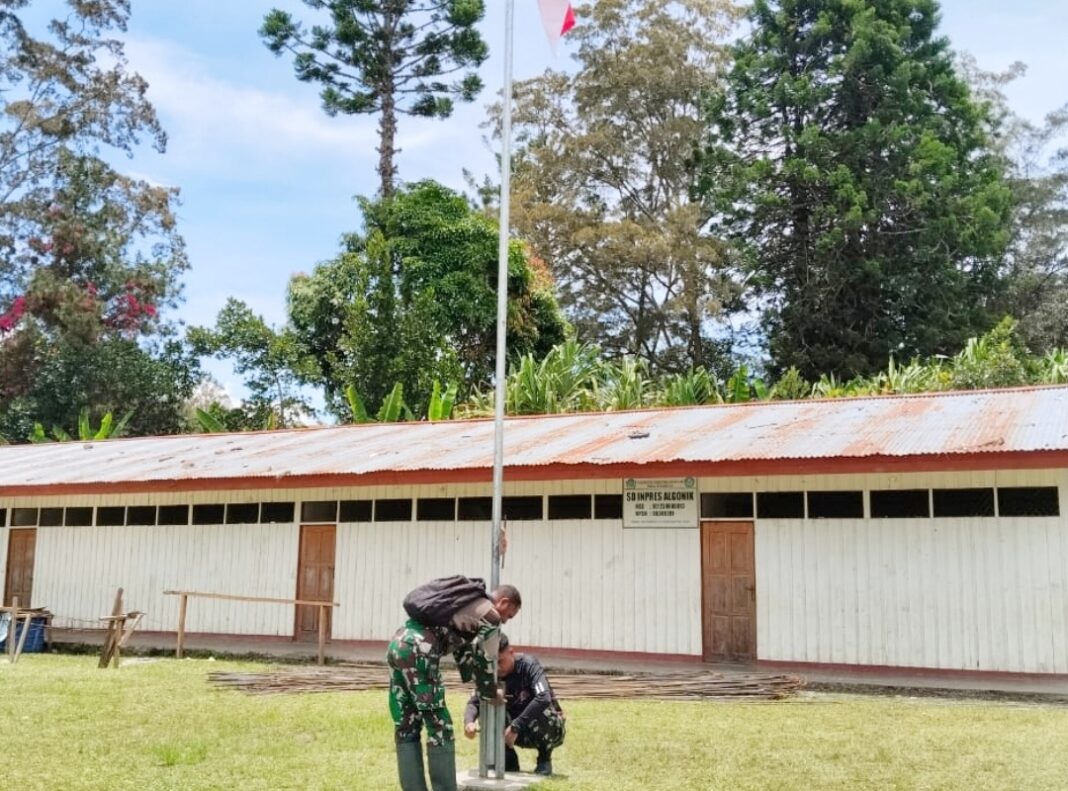 Satgas TMMD Tegakkan Tiang Bendera, SD Inpres Algonik Kian Berwarna