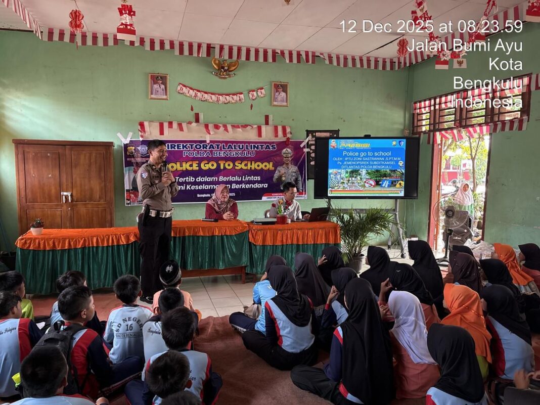 BENGKULU – Ditlantas ( Direktorat Lalu Lintas ) Polda Bengkulu melalui Subdit Kamsel Ditlantas Polda Bengkulu melaksanakan kegiatan Police Go To School di SDN 16 Kota Bengkulu pada Jumat,12 Desember 2025. Kegiatan ini bertujuan untuk memberikan penyuluhan dan sosialisasi tentang tertib berlalu lintas kepada siswa-siswi dan Guru-guru SDN 16 Kota Bengkulu.