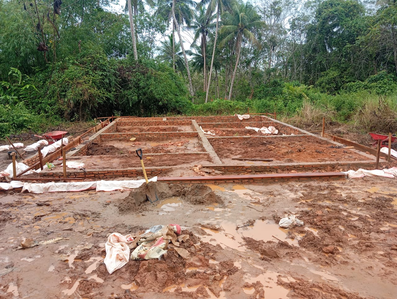 Personel yang terlibat dalam pekerjaan khusus untuk rumah ini telah membagi tugas secara terstruktur, mulai dari penggalian lubang penyangga, penimbunan pasir dan batu pecah sebagai dasar pondasi, hingga penataan bata merah sebagai struktur penyangga utama. Selain itu, material tambahan seperti kayu telah dipersiapkan dan diangkut dari pinggir dermaga ke lokasi kerja menggunakan traktor dengan gerobak modifikasi, untuk mendukung kelanjutan tahap konstruksi setelah pondasi selesai.